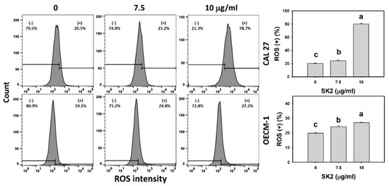SK2 prompts ROS induction in oral cancer cells. ROS detections and statistics are provided. Cells were exposed to SK2 (0 (0.1% DMSO), 7.5, and 10 µg/mL) for 24 h. (+) in each panel represents ROS (+). Data (means ± SDs; n = 3) without overlapping characters differed significantly (p < 0.05). For an example of CAL 27 and OECM-1 cells, different concentrations with different characters produced significantly different results. For CAL 27 and OECM-1 cells, for SK2 at 0, 7.5, and 10 µg/mL, “c, b, and a” indicate significant differences because the data did not overlap.