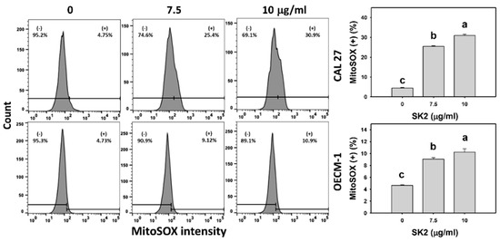 SK2 prompts MitoSOX induction in oral cancer cells. MitoSOX detections and statistics are provided. Cells were exposed to SK2 (0 (0.1% DMSO), 7.5, and 10 µg/mL) for 24 h. (+) in each panel represents MitoSOX (+). Data (means ± SDs; n = 3) without overlapping characters differed significantly (p < 0.05). For an example of CAL 27 and OECM-1 cells, different concentrations with different characters produced significantly different results. For CAL 27 and OECM-1 cells, for SK2 at 0, 7.5, and 10 µg/mL, “c, b, and a” indicate significant differences because the data did not overlap.