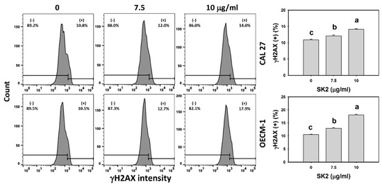 SK2 prompts γH2AX induction in oral cancer cells. γH2AX detections and statistics are provided. Cells were exposed to SK2 (0 (0.1% DMSO), 7.5, and 10 µg/mL) for 24 h. (+) in each panel represents γH2AX (+). Data (means ± SDs; n = 3) without overlapping characters differed significantly (p < 0.05). For an example of CAL 27 and OECM-1 cells, for different concentrations, different characters indicate significant differences.