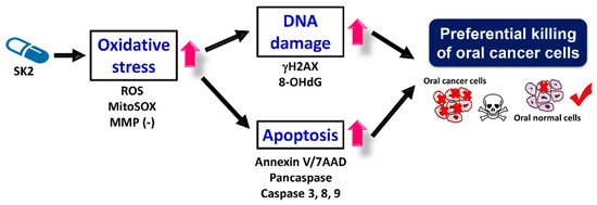 We previously used the benzo-fused dioxabicyclo[3.3.1]nonane core to synthesize a novel nitrated [6,6,6]tricycle-derived compound containing an n-butyloxy group (SK2). However, the biological function of SK2 was not investigated. The present study validated that SK2 preferentially killed oral cancer cells but showed no harmful effect on non-malignant oral cells. Mechanistically, SK2 induced oxidative stress, triggered apoptosis, and caused DNA damage to oral cancer cells (Figure 10). Elucidating these mechanisms may improve the anticancer application of SK2 to oral cancer therapy.