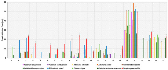 26]; however, due to a different type of extract, these findings were not reflected in the present work. The detailed results of phytopathogen growth inhibition by water-glycol extracts are presented in