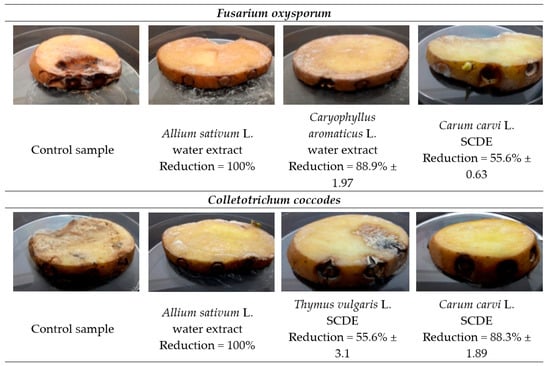 20], probably due to the addition of ethanol as a solvent, enriching the extract in active compounds. Discrepancies in antifungal activity may result from differences in the chemical composition of individual extracts depending on plant variety, storage methods, or the exact extraction procedure. The detailed results of phytopathogen growth inhibition by water extracts are presented in