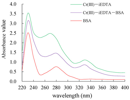 In the UV range between 220–400 nm, BSA has a characteristic peak at 278 nm, Cr(III)-iEDTA, which is conjugate of Cr(III) and isothiocyanatebenzyl-EDTA (iEDTA), has two characteristic peaks at 264 and 332 nm, and Cr(III)-iEDTA-BSA has two characteristic peaks at 272 and 332 nm, which contains, simultaneously, the characteristic peaks of BSA and Cr(III)-iEDTA (Figure 1). The results indicated that the immunogen synthesis was successful and based on the Lambert–Beer law, the calculated molar ratio of Cr(III)-iEDTA to BSA was 15.45:1.