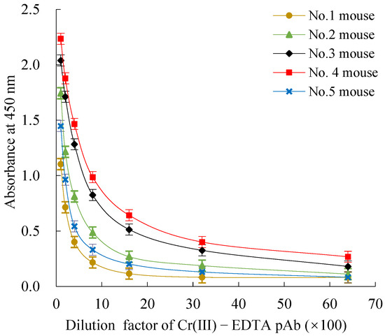 The titers and the 50% inhibition concentration (IC50) values of Cr(III)-EDTA polyclonal antibodies (pAbs) derived from the five immunized mice after the five inoculations were determined by both an indirect non-competitive ELISA (inELISA) and an indirect competitive ELISA (icELISA). The five immunized mice had a strong positive immune response, and the titers exceeded 1: (1.6 × 103), in which the immune response of mouse No.4 was the most effective where the titers reached 1: (5.12 × 104) (Figure 2). Meanwhile, all five immunized mice could recognize Cr(III)-EDTA well, and among them, the IC50 value of mouse No.4 was the lowest (24.8 μg/L) (Figure 3). Owing to the highest titers and lowest IC50 value, mouse No.4 was selected for the next cell fusion step.