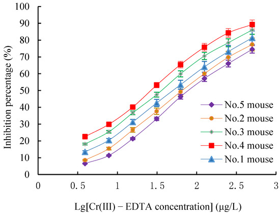 The Cr(III)-EDTA standard stock solution was diluted with PBS at various concentrations (0.625, 1.25, 2.5, 5.0, 10.0, 20.0, 40.0, 80.0 and 160.0 μg/L), and a nine-point standard curve of icELISA under the above-optimized conditions was achieved by plotting the gradient concentrations (Log C) versus the inhibition percentage values, and the inhibition percentage was calculated using the equation [51,52]: