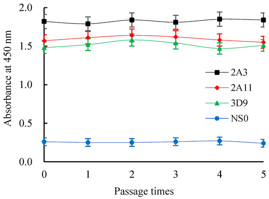 A mouse mAb isotyping kit was adopted to determine that 2A3 and 2A11 mAbs belonged to the IgG1 isotype with a kappa light chain, and 3D9 mAb was of the IgG1 isotype and possessed a lambda light chain (Figure 4). The absorption values of the cell culture supernatants before cryopreservation of three hybridomas were basically consistent with that after five times of cryopreservation, resuscitation, and subculture, indicating that three hybridomas could stably secrete antibodies (Figure 5).