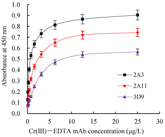 The Ka of Cr(III)-EDTA mAb 2A3, 2A11, and 3D9 were 2.69 × 109, 1.03 × 109 and 7.85 × 108 L/moL, respectively (Figure 6). Since 2A3 had the highest affinity, it was selected for further experimentation to develop icELISA.