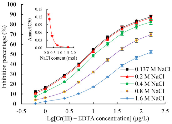 The chessboard titration results indicated that the optimal concentration of the coating antigen Cr(III)-iEDTA-OVA was 2.0 µg/mL, mAb 2A3 was 0.6 µg/mL (1:20,000), and GaMIgG-HRP was 0.6 µg/mL (1:1000) (data not shown). Four combinations of mAb dilution buffer and standard preparation buffer were performed to investigate the effect of the assay buffer. As shown in Table 2, when Cr(III)-EDTA and 2B6 mAb were dissolved in Hepes buffer solution (HBS), IC50 was slightly decreased and Amax/IC50 was slightly increased, indicating that the K+ concentration had a certain effect on icELISA performance. Therefore, HBS was chosen as assay buffer. The effect of HBS buffer ionic strength on icELISA is shown in Figure 7. The results showed that with the continuous increase in ionic strength, the Amax/IC50 gradually decreased while the IC50 value gradually increased, i.e., the sensitivity of icELISA decreased. Therefore, the best minimum NaCl content in HBS buffer was 137 mM; hence, there was no need to increase the ionic strength. The effects of the pH values on the icELISA are shown in Figure 8. The pH values between 5.0 and 9.0 had a significant effect on the Amax/IC50 and IC50 values. However, the Amax/IC50 was highest and the IC50 value was lowest at a pH of 7.4, indicating full binding between the antibodies and the antigen. Therefore, the HBS with a pH value of 7.4 was selected for an icELISA.