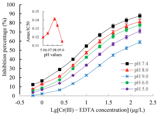 The effects of pH value on an icELISA. Insets indicate the fluctuations of Amax/IC50 as a function of pH value.