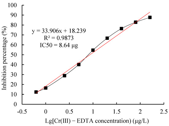 As per the above-optimized conditions, the standard curve of Cr(III)-EDTA icELISA was established (Figure 9). The derived linear regression equation was y = −33.906x + 18.239 and IC50 value was 8.64 μg/L.