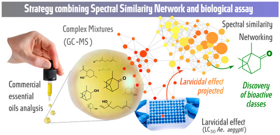In this study, we propose a strategy combining the spectral similarity networking (molecular networking) approach with larvicidal activity tests against Ae. aegypti to analyze commercial essential oils with the aim of discovering potential bioactive metabolic classes. The GC-MS retention time and fragmentation, chemotaxonomy and larvicidal activity against Ae. aegypti (LC50 values) of essential oils were organized, grouped and evaluated by molecular networking. Figure 1 shows a graphical representation of the strategy.