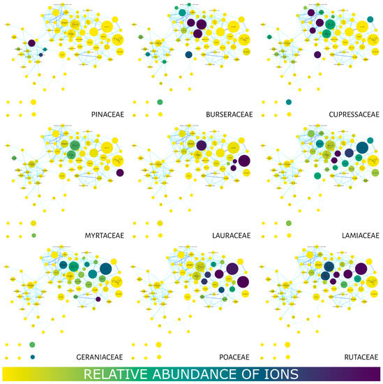 Figure 3 shows the MN using the compound distribution filter (relative abundance of ions) among the families using a color gradient in the nodes. Yellow represents little or no abundance, while blue represents a high abundance of ions. The Burseraceae and Cupressaceae families presented a strong correlation with most of their compounds (nodes) located in the region with the lowest retention times. Geraniaceae and Lamiaceae displayed a wide distribution of their compounds in the MN, while metabolites in Lauraceae, Myrtaceae, Poaceae and Rutaceae were observed between 7 and 20 min. Pinaceae concentrated its compounds in longer retention times.