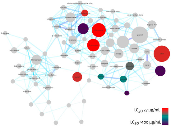 Molecular network filtered by LC50 values calculated for larval mortality at 48 h of Ae. aegypti for monoterpenes: α-fenchene (>100 µg/mL), eucalyptol (>100 µg/mL), menthol (>100 µg/mL), citronellol (65.3 µg/mL), citronellal (57.8 µg/mL), cymol (41.7 µg/mL), citral (40.1 µg/mL), α-phelandrene (40.1 µg/mL), D-limonene (27.1 µg/mL). Red nodes represent high larvicidal activity and dark blue nodules represent LC50 values > 100 µg/mL.