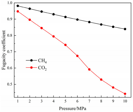 In this study, the calculation and analysis of the molecular simulation were all realized using Materials Studio 8.0. The adsorption parameters of CH4 and CO2 in coal pores were acquired by the adsorption isotherm and fixed-pressure tasks in the sorption module. The temperature set by the simulation was 293.15 K, and the pressure range was 0–10 MPa. The pressure value selected in the simulation process was the fugacity value. In this study, Peng–Robinson realized the conversion between pressure and fugacity [33]. The relationship between pressure and the fugacity coefficient of the single-component gas and the binary-mixture gas is shown in Figure 2 and Figure 3. The force field in the adsorption process is the COMPASS force field, which is often used to simulate organic and inorganic molecules and can accurately predict the properties of molecules and polymers [34,35]. At the same time, many researchers have found that the COMPASS force field can be used to simulate the adsorption and diffusion properties of small gas molecules in macromolecules such as coal and shale.