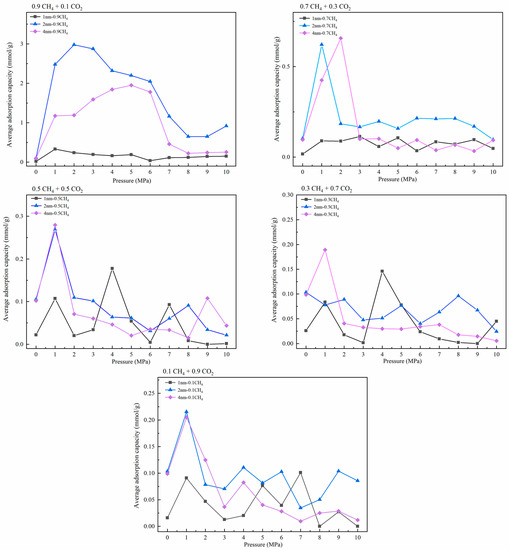 The adsorption capacity variation under different molar ratios of CH4 and CO2 was obtained by Langmuir fitting to explore the character of gas competitive adsorption under different pore sizes. The selected molar ratios were 0.9:0.1, 0.7:0.3, 0.5:0.5, 0.3:0.7, and 0.1:0.9. At the same time, we also explored the adsorption capacity of CH4 and CO2 in the pores. The adsorption temperature was 293.15 K and the pressure range was 0–10 MPa. Figure 4 is the adsorption isotherm of the single-component gas in the pores, and Figure 5 shows the gas’s isothermal adsorption curve with different molar ratios. In the study of competitive adsorption of binary gases, due to the obvious competitive adsorption advantage of CO2, the adsorption amount of CH4 in binary mixtures is low, which is lower than 3 mmol/g. Therefore, the adsorption data of CH4 are not fitted in this study, and the curve only represents the changing trend of adsorption amount with pressure. The adsorption amount of CH4 is shown in Figure 6.