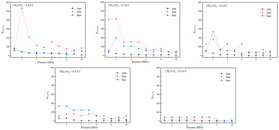 To determine the competitive adsorption capacity of CH4 and CO2 in coal pores, Figure 7 shows the relationship between the adsorption selectivity of the binary system and pressure at 298.15 K with different volume–mole fractions. In Figure 7, as the proportion of CO2 decreases, the corresponding SCH4/CO2 shows a decreasing trend. When the proportion of CO2 is higher than 0.5, the corresponding selective adsorption coefficient at the 2-nm pore size is larger, and the competitive adsorption advantage of CO2 at the 1-nm pore size is not apparent due to the small free-activity range. Due to the relatively sizeable mobile space of gas in the 2-nm coal pore, when the mole ratio of CO2 is less than 0.5, the competitive adsorption advantage of CO2 is more prominent. When the pore size is 4 nm, due to the extensive range of free space, the adsorption capacity of gas on both sides of the pore wall is enhanced, and finally, the competitive adsorption characteristics of gas in the pore are not obvious compared with the 2-nm pore. By comparing the competitive adsorption advantage of CO2 under different pore sizes and different molar ratios, it can be found that when the pore pressure is greater than 6 MPa, the competitive adsorption advantage of CO2 begins to decrease. At the same time, the competitive adsorption advantage decreases with the increase in CO2 concentration, which is also consistent with the isothermal adsorption law. The above research results are consistent with those of Hang et al.; that is, the higher CO2 concentration in the mixed gas corresponds to a smaller adsorption selectivity coefficient [38]. Through comprehensive analysis of the change law of the selective adsorption coefficient, it can be found that when the proportion of CO2 is less than 0.5, the highest selective adsorption coefficient appears at 2 MPa. These results show that relatively low pressure and CO2 concentration are more conducive to CH4 displacement.