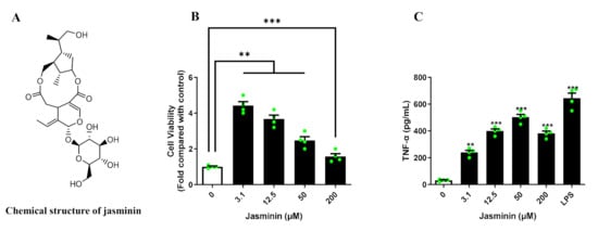 (A) The chemical structure of jasminin. (B) Jasminin enhances the proliferation of RAW 264.7 cells. (C) RAW264.7 cells treated with jasminin (3.1, 12.5, 50, and 200 μM) or LPS (1 μg/mL) for 24 h. The medium was collected to determine the TNF-α level using ELISA. Values are expressed as mean ± SD, n ≥ 3. ** p < 0.01 and *** p < 0.001 vs. control (jasminin-untreated).