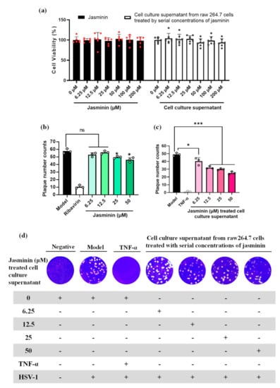 The plaque reduction assay of jasminin and RAW 264.7 cell culture supernatants stimulated by jasminin to inhibit HSV-1. (a) Cytotoxicity test on Vero E6 cells for jasminin alone or supernatants from RAW 264.7 cells treated by jasminin. (b) Antiviral effects of jasminin alone on Vero E6 cells infected with HSV-1. Ribavirin (20 μg/mL) served as a positive control. (c) Antiviral activity of RAW 264.7 cell culture supernatant stimulated by jasminin on HSV-1. RAW264.7 cells were treated with various concentrations of jasminin (6.25, 12.5, 25, and 50 μM) for 24 h. Recombinant TNF-α (100 pg/mL) was served as a positive control. (d) Crystal violet-stained Vero E6 cell monolayers showing plaques generated by HSV-1 at 72 h postinfection. For each well, jasminin cell culture supernatants were finally 10-fold diluted. Experiments were performed in triplicate, and results are shown as the mean ± SD. * p < 0.05 and *** p < 0.001 compared to control.