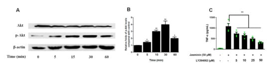 2.3. Akt Phosphorylation Mediates TNF-α Production Induced by Jasminin