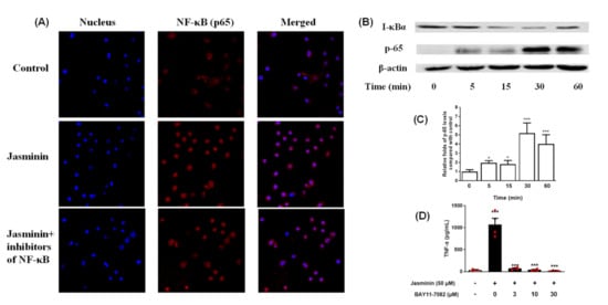 The NF–κB family of transcription factors has an essential role in TNF-α secretion. Jasminin activates the MAPKs, which activate the classical pathway of NF–κB transcription factors including NF–κB (p65) and I-κBα, which coordinate the expression of its responsive cytokine TNF-α. As shown in Figure 5A, when the cells were additionally treated with jasminin, the nuclear translocation was activated. However, pretreatment with the NF–κB inhibitor for 1 h further significantly suppressed NF–κB p65 nuclear translocation via immunofluorescence analysis. We further observed that jasminin activated the NF–κB signal pathway in a time-dependent way by Western blot analysis (Figure 5B), which indicated that jasminin-induced TNF-α secretion is partly due to its NF–κB-activation effects.