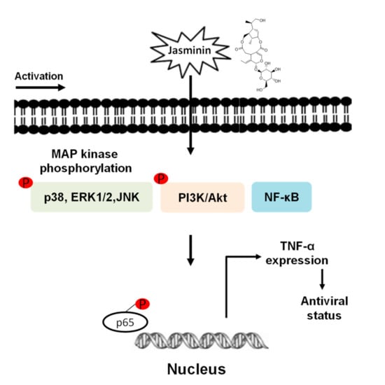 Multitude of natural products are known to regulate endogenous cytokine production [9,10,11,12,13]. Jasminin is a secoiridoid glucoside isolated from the leaves of Jasminum nudiflorum Lindl., which is commonly used in the folk medicine of many Asian countries. In China, the leaves of J. nudiflorum are used as medicinal herbs for treating many disorders, including influenza, fever, and wound-healing [14]. However, very few studies have reported the biological effects of jasminin. Thus, our current research studies the antiviral effects of jasminin, one of the major constituents of J. nudiflorum, which may help explain its use in folk medicine.