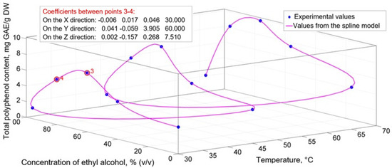 Cubic spline functions, which provide mathematical descriptions with variable coefficients, were used to model the extraction process. Figure 1 shows a mathematical model of the type TPC = f (t, C) for GME, using cubic spline functions. As can be seen, the modeling accuracy is maximum. The mathematical model curve goes through all 15 experimental points. For each interval between two points, different coefficients are obtained (in Figure 1 between experimental points 3 and 4), and the number of coefficients is represented by the degree of the polynomial. For a cubic spline function (k = 3), four coefficients are presented for each interval (k + 1 = 4) and for the three directions (x, y and z, which in this case represent the temperature (t), the concentration of the ethanolic solution (C) and the total polyphenol content (TPC). The results for the 15 experimental values are 14 groups of four coefficients obtained for each of the three directions, rendering (15 − 1) × 3 × 4 = 14 × 3 × 4 = 42 × 4 = 168 coefficients in total.