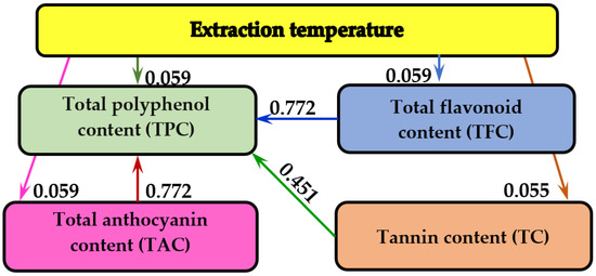 The informational analysis of the experimental data allowed us to establish the influence of temperature on the extraction yield of polyphenolic compounds during the experiments (Figure 3). It was shown that the extraction temperature had less influence on the measured parameters than the interdependence between polyphenolic compounds TAC–TPC and TFC–TPC, probably due to the short extraction time (90 min). The influence of pH and different salts (NaCl, CaCl2, KNO3) at different concentrations (0.001–0.1M) on the CIELab color parameters of rosehip extracts was studied by informational analysis [64].