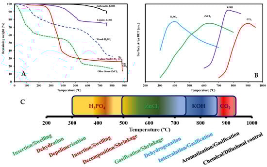 Thus, in general terms, Figure 2B exemplifies the different optimum activation temperature ranges for H3PO4 (350–500 °C), ZnCl2 (500–700 °C), and KOH (700–900 °C).