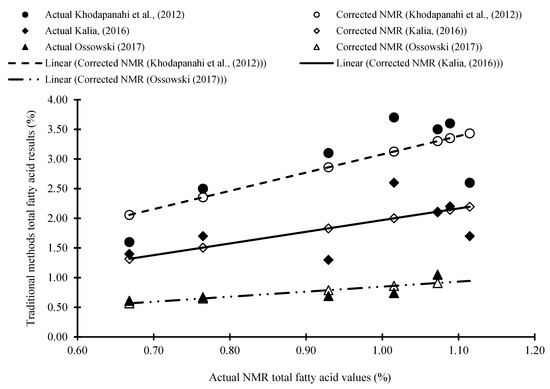 The NMR method employed in this study is rapid and non-destructive compared to traditional solvent extraction methods, and a correlation between the NMR method and other traditional methods was observed. Correlation coefficients of 0.77 (R2 = 0.60), 0.56 (R2 = 0.47), and 0.78 (R2 = 0.62) were observed in the Khodapanahi et al. (2012), Kalia (2016), and Ossowski (2017) studies, respectively (Table 2). Correlation coefficients were determined by comparing the results from the NMR and the three studies. The correlation coefficients for each method increased to 0.97 (R2 of 0.99) when NMR data were corrected with respect to the other methods using a correction factor, namely 3.08, 1.97 and 0.85 for Khodapanahi et al., (2012), Kalia, (2016), and Ossowski, (2017) respectively (Figure 2). The correction factor used was the average ratio of the data acquired for each traditional method to the NMR data. Statistical analyses showed no significant differences (p > 0.05) between the corrected NMR data for NMR and the corresponding quantitative data acquired with traditional methods. This demonstrates that NMR can effectively quantify total lipids in field pea seeds.