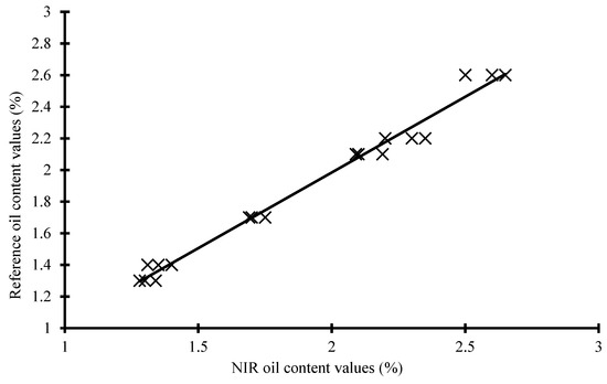 From the PLS regression analyses (Table 3), different approaches for pre-processing data were assessed for the ability to produce models that best fit the acquired data. Results describing the validation models produced are summarized in Table 3. When using NIR spectroscopy for oil determination in pea seeds [21], the use of PLS regression is recommended over other multivariate tests, such as principal component regression. Here, the effectiveness of PLS is demonstrated through the coefficient of determination (R2) and the standard error of cross-validation (SECV), which is the error of cross validation when corrected for bias using the CAMO Unscrambler® X Software (CAMO Analytics, Oslo, Norway).