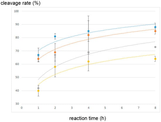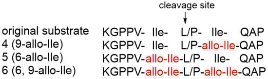 Cleavage reaction of the substrates containing allo-Ile residues by the HTLV-1 protease: blue, original substrate; orange, substrate 4; gray, substrate 5; yellow, substrate 6.