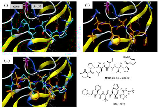 Docking model of compound 10 with the HTLV-1 protease: (i) interaction model for compound 10 (blue) with a Generalized-Born Volume Integral/Weighted Surface Area (GBVI/WSA) dG score of −11.0069 kcal/mol; (ii) X-ray crystal structure of KNI-10729 (orange); and (iii) overlapped model of compound 10 and KNI-10729.