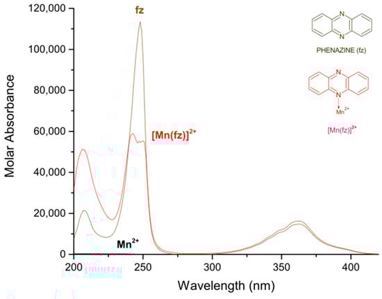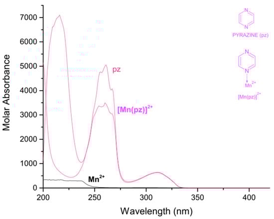 Finally, for the complex [Mn(fz)]2+ the absorption peaks are observed at 207 nm with a ε = 51,269 L mol−1 cm−1, 242 nm with a ε = 58,831 L mol−1 cm−1 and 362 nm with a ε = 16,208 L mol−1 cm−1. Additionally, the phenazine presents a molar absorbance at 208 nm with ε = 21,447 L mol−1 cm−1, at 248 nm with ε = 113,385 L mol−1 cm−1 and at 363 nm with a ε = 14,736 L mol−1 cm−1. According to Figure 3, except the peak at 363 nm, several signals of the phenazine change with the coordination of manganese (II), for example the signal at about 207 nm suffers an hyperchromic change, the signal at 248 nm suffers an hypochromic change and the peak changes from sharp to broad. There is a great difference in the absorption of manganese(II) complexes when pyrazine, quinoxaline or phenazine are used, in which the manganese(II)–phenazine generates the complexes with a higher molar absorption. This is probably related to the increase in aromatic character of the ligand. On the other hand, the peaks observed at 216 or 260 nm for the [Mn(pz)]2+, at 209 or 232 nm for the [Mn(qx)]2+ and 207 or 242 nm for the [Mn(fz)]2+, can be assigned to an intra-ligand absorption π → π* [36,37]. Additionally, the peaks observed at 311 nm for [Mn(pz)]2+, 315 nm for [Mn(qx)]2+ and 363 nm for [Mn(fz)]2+ can be assigned to n → π* absorptions [38,39,40].