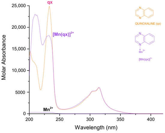For the complex [Mn(qx)]2+, the absorption peaks are observed at 209 nm with a ε = 23,008 L mol−1 cm−1, 232 nm with a ε = 18,080 L mol−1 cm−1 and 315 nm with a ε = 6129 L mol−1 cm−1. Additionally, the quinoxaline presents a molar absorbance at 202 nm with ε = 14,419 L mol−1 cm−1, at 233 nm with ε = 24,913 L mol−1 cm−1 and at 315 nm with a ε = 6019 L mol−1 cm−1. According to Figure 2, several signals of the quinoxaline change with the coordination of manganese (II), except the peak at 315 nm.