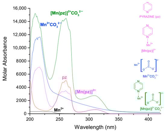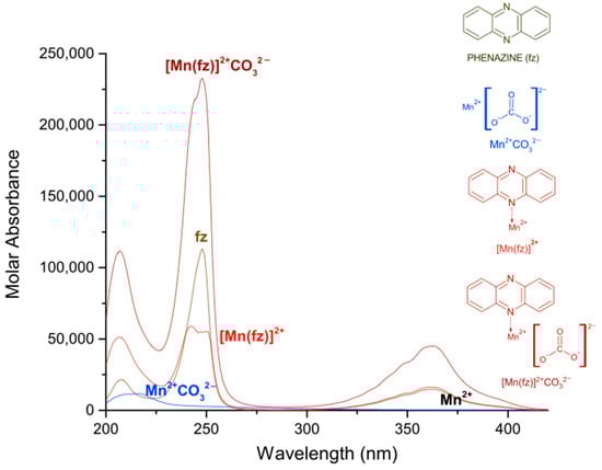 Finally, the complex [Mn(fz)]2+ also displays three absorption peaks at 207 nm with ε = 111,790 L mol−1 cm−1 and at 247 nm with ε = 232,940 L mol−1 cm−1 and 361 nm with ε = 44,869 L mol−1 cm−1. The spectrum of the complexes with carbonate maintains its maximum wavelength absorption, resembling the spectra of non-carbonated complexes, but its molar absorbance is augmented.