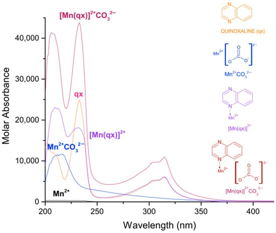 Calculated electronic spectrum of manganese(II)–quinoxaline–carbonate in methanol: Mn2+, [Mn(qx)]2+, Mn2+ and [Mn(qx)]2+.
