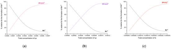The speciation diagrams of the manganese(II)–pyrazine, manganese(II)–quinoxaline and manganese(II)–phenazine systems are shown in Figure 8a–c, respectively. A solution with equimolar concentrations of manganese(II) and pyrazine (at 0.000348 M or 0.000696 M, for low- and high-concentration experiments, respectively), roughly yields 77% of the manganese(II)–pyrazine complex and about 23% of free manganese. Yet, two molar equivalents of pyrazine per manganese(II) generates about 94% of manganese(II)–pyrazine complex and 6% of manganese(II).