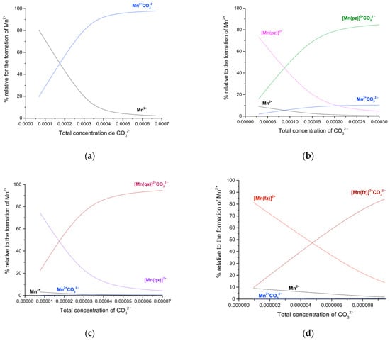 Figure 9a–d display the speciation diagrams of the manganese(II)–carbonate, manganese(II)–pyrazine–carbonate, manganese(II)–quinoxaline–carbonate and manganese(II)–phenazine–carbonate, respectively.