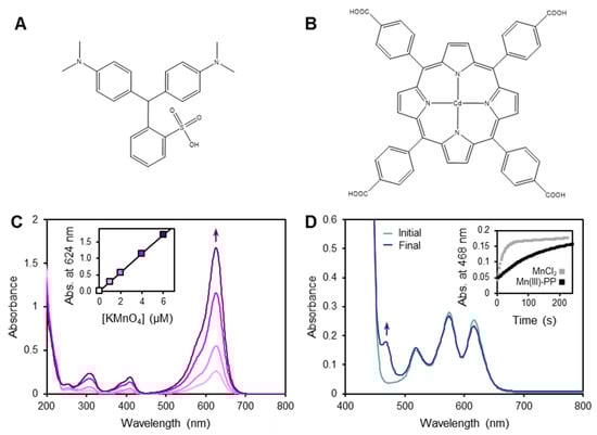 Leucoberbelin blue (LBB) and Cd-porphyrin (TCPP) spectrophotometric methods for detecting manganese species. (A,B) Chemical structures of the LBB (A) and Cd(II)–TCPP (B) reagents. (C,D) UV–vis absorbance spectra illustrating the application of these methods. (C) LBB method on a standard curve of KMnO4 solutions, with the inset showing the linear absorbance change at 624 nm with KMnO4 concentration due to oxidation of LBB. (D) TCPP method on a standard solution of MnCl2, showing the change in absorbance at 468 nm from Mn(II) substitution and oxidation to generate Mn(III)–TCPP. Inset shows the kinetic profile of this reaction, along with the Mn(III)–PP ligand-exchange reaction to generate Mn(III)–TCPP.