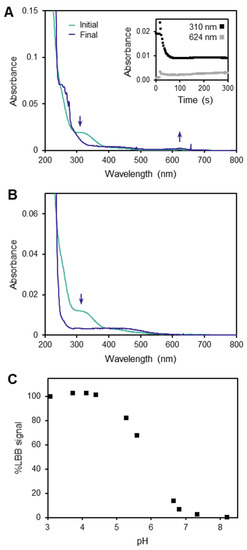 The LBB method is typically carried out in an acetic acid solution, at pH ~3 [20,21,22,24]. However, the Mn(III)–DFOB complex is known to persist only in solution within the pH range of ~7–11 [17]. We attempted to measure Mn(III)–DFOB by using LBB and did not observe the spectral change at 624 nm characteristic of LBB oxidation (Figure 2A), as is consistent with previous reports that Mn(III)–DFOB does not react with LBB [24]. However, by also monitoring the absorbance spectrum at 310 nm for the characteristic absorbance of Mn(III)–DFOB, we found that the Mn(III)–DFOB disappeared on a timescale of seconds upon introduction to the reaction solution of the LBB assay. The same phenomenon occurred when acetic acid without LBB was introduced to the Mn(III)–DFOB solution (Figure 2B). These results demonstrated that the lack of reaction with LBB occurred not because the Mn was so strongly bound that the LBB could not access it, but rather because the complex disintegrated in the low-pH reaction solution before it had an opportunity to react with LBB. Since the mechanism of decomposition reduces Mn(III) to Mn(II) [17], which does not react with LBB, this explained why the LBB assay does not detect Mn(III)–DFOB.