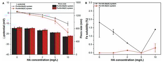 Influence of HA concentration on (A) zeta potential (mV) and size (nm) of freshly formed Fe flocs; (B) Fe solubility (%) and; (C) Sb removal (%) and TOC removal (%) in Sb(III, V) suspensions.