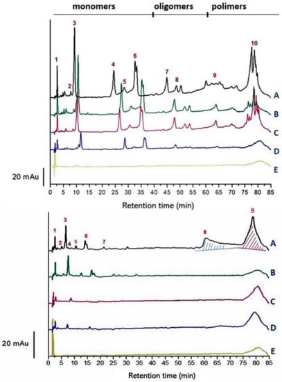 Three main regions were identified (based on previous findings): monomeric (i.e., gallic acid, catechin, epicatechin, and syringic acid), oligomeric, and polymeric polyphenolic compounds [20]. The fining agents clearly removed the targeted polyphenolic compounds differently, with MCP being by far the most active over the entire HPLC profile, removing from monomers to polymers hump. The effect of PP was comparable with PVPP, especially when considering gallotannins; the former proved to be effective at removing polymeric compounds as well. The rare peak values higher than 100% are negligible, considering the precision of the method (about 5%) and the very small area under the peak involved: (ca. 0.7% of the total peak area) for catechin (peak n. 2) in gallotannin trials and flavanol-3 (peak n. 5) in grape seed tannin trials (Table 2).