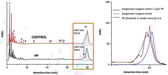 Based on the preliminary findings using model wine solution, the dosage of PP was increased to 2 g/L in the trials using Sangiovese red wine. As expected, Sangiovese red wine showed an HPLC profile with many peaks at 280 nm: the early retention times correspond primarily to monomeric phenolic compounds and the late times primarily to polymeric phenolic compounds (Figure 3, Table 3). Although PP was able to remove about 35% of the latter (Table 3: peak n. 13), the chromatogram overlay of Sangiovese red wine with PP at approximately 80 min showed the presence of an extra peak which lacking in the control. The occurrence of a soluble tannin–protein complex was postulated to explain this finding. Indeed, the HPLC signal of PP alone overlapped those of polymeric phenolics at approximately 80 min. This result, consistent with the UV-Vis spectra properties of PP (Figure 1), will be exploited in future studies to obtain more insight into the tannin–protein interaction.