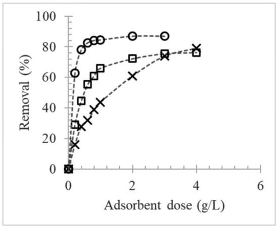 where x is the amount of solute adsorbed on a mass m of solid at equilibrium time (mg/g) and S is the equilibrium solute concentration that remains in solution after adsorption (mg/L). The constants KL and (x/m)max (or KF and 1/n) represent the binding constant related to the absorption pair; they can be calculated by plotting double reciprocal plots (x/m against 1/S) and a log–log plot (x/m against S) for the Langmuir and Freundlich equations, respectively, using regression analysis (Addinsoft XLSTAT 2018, Paris, France).