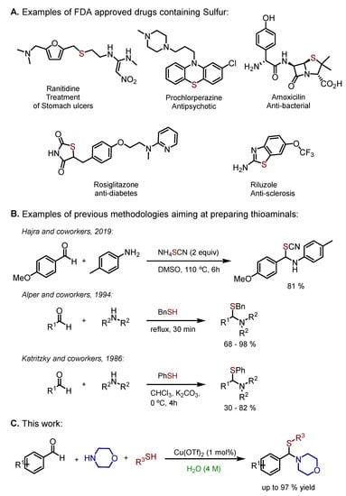 Focusing on the medicinal chemistry area, sulfur is a key constituent of over 20% of FDA-approved drugs [,], being responsible for favorable interactions on the targeted active site (Figure 1A) []. Amongst the sulfur-containing scaffolds, heterocycles such as thiazolidines and thiazolidinones have revealed a variety of biological activities [,,], leading to abundant procedures for the formation of these cyclic S,N-aminals (thioaminals) [,,,,,]. However, reports on the formation of acyclic thioaminals are scarce, often requiring harsh conditions including hazardous reagents, affording poor yields or being limited to non-isolated intermediaries (Figure 1B) [,,,].