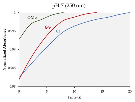 Following our previous studies on the stability of N,N-aminals, in which was observed that the electron-donating groups in the aldehyde stabilized the products, we enquired into the role of substituents in the arylthiol. To this end, we accessed the rates of hydrolysis of three thioaminals bearing electron-withdrawing (14) and electron-donating (9,11) para substituents by UV-vis spectroscopy, as depicted in Figure 3. We observed a fast hydrolysis of <20 s in these diluted conditions (see Supplementary Materials, Figures S21 and S23). Despite this, a trend was observed where electron-withdrawing substituents on the thiol slightly hindered the hydrolysis of the products.