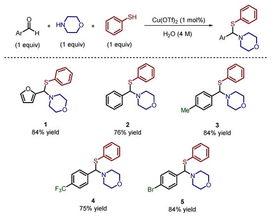 Selecting furfural, morpholine and thiophenol as model substrates, a screening of conditions was initially performed to identify the most suitable catalyst and solvent (Table 1). The formation of thioaminal 1 in the presence of catalytic copper(II) triflate (1 mol%) in aqueous media afforded the desired product in 84% isolated yield after 10 min of reaction (Table 1, entry 3). In the absence of catalyst, 100% of starting furfural was recovered (Table 1, entry 1), while an increase in catalyst loading to 10 mol% resulted in full conversion to the corresponding cyclopentenone (Table 1, entry 2) [,]. Other attempted metal-based catalysts (i.e., CuSO4, FeCl3, AlCl3 and ZnCl2) and Brønsted acids (i.e., triflic acid) also led to the formation of cyclopentenone as a side-product (Table 1, entries 7–11) [,]. Performing the reaction under neat conditions or by changing the solvent to ethanol or acetonitrile did not allow full conversion and caused a visible contamination with cyclopentenone (Table 1, entries 4–6). Thus, water was considered the most suitable solvent for this reaction.