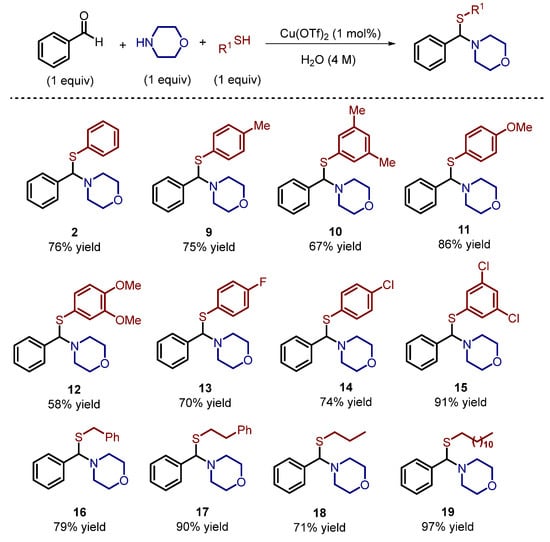 Next, a series of aryl and aliphatic thiols were reacted with benzaldehyde and morpholine (Scheme 3). The reaction withstood electron-rich thiols such as 4-Me, 3,5-diMe, 4-OMe and 3,4-diOMe thiophenol yielding the thioaminal products 9–12 in good yield. Electron-poor thiol such as 4-F, 4-Cl and 3,5-diCl thiophenol also afforded the desired products, 13–15, in good to excellent yields. A reaction with 4-NO2-thiophenol was also attempted, but only 63% conversion to the thioaminal was observed, without the possibility of purification. Finally, alkyl thiols also afforded products 16–19 in good yield, even when long-alkyl-chain thiols (i.e., dodecanethiol) were employed.