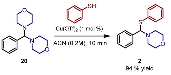 Intrigued by the selective formation of the thioaminal, a solution of the aminal in acetonitrile was reacted with thiophenol in the presence of a catalyst and a full conversion of aminal 20 was observed to the corresponding thioaminal 2, isolated in 94% yield (Scheme 4).