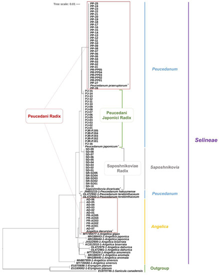 - Wang, L.; Yu, X.; Xu, W.; Zhang, J.; Lin, H.; Zhao, Y. Complete chloroplast genome sequencing support Angelica decursiva is an independent species from Peucedanum praeruptorum. Physiol. Mol. Biol. Plants 2021, 27, 2503–2515. [Google Scholar] [CrossRef] [PubMed]